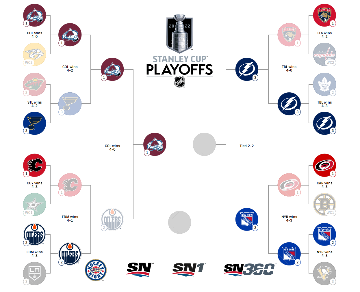 StnCld316 Posted June 1, 2022 Author Posted June 1, 2022 EASTERN CONFERENCE New York Rangers (M2) vs. Tampa Bay Lightning (A3) Wednesday, June 1: Lightning at Rangers, 8 p.m. ET; ESPN, SN, CBC, TVAS Friday, June 3: Lightning at Rangers, 8 p.m. ET; ESPN, SN, CBC, TVAS Sunday, June 5: Rangers at Lightning, 3 p.m. ET; ESPN, SN, CBC, TVAS Tuesday, June 7: Rangers at Lightning, 8 p.m. ET; ESPN, SN, CBC, TVAS *Thursday, June 9: Lightning at Rangers, 8 p.m. ET; ESPN, SN, CBC, TVAS *Saturday, June 11: Rangers at Lightning, 8 p.m. ET; ESPN, SN, CBC, TVAS *Tuesday, June 14: Lightning at Rangers, 8 p.m. ET; ESPN, SN, CBC, TVAS WESTERN CONFERENCE Colorado Avalanche (C1) vs. Edmonton Oilers (P2) Tuesday, May 31: Oilers at Avalanche, 8 p.m. ET; TNT, SN, CBC, TVAS Thursday, June 2: Oilers at Avalanche, 8 p.m. ET; TNT, SN, CBC, TVAS Saturday, June 4: Avalanche at Oilers, 8 p.m. ET; TNT, SN, CBC, TVAS Monday, June 6: Avalanche at Oilers, 8 p.m. ET; TNT, SN, CBC, TVAS *Wednesday, June 8: Oilers at Avalanche, TBD *Friday, June 10: Avalanche at Oilers, TBD *Sunday, June 12: Oilers at Avalanche, TBD * -- if necessary TBD -- to be determined