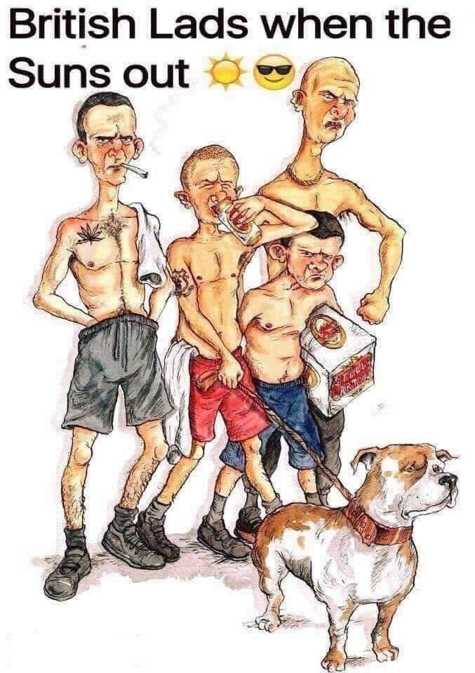 Brit Guy Posted 6 minutes ago Posted 6 minutes ago 2 minutes ago, Maxbell said: lol, that dog has no decent training at all. Its up on everything trying to get at stuff. It’s like it’s never been indoors. And Elli not even winking when its feet are up against the table top and its sniffing what’s on the table. Probably a nice dog as long as it doesn’t bite you. 😃 I saw it walking and climbing all over the coffee table earlier (the black one by the sofa). The guy reminds me very much of what we in the UK would call a Chav or a Lager Lout or even Council Estate Bumder ...someone who is tall and thin and sporting shitty/dodgy tattoos. Often seen walking around topless in the summer being a gobshite, pissed as a skunk and drinking tins of Stella (wife beater drink) as it's known in the UK, and a hard as fuck looking dog on a chain. They'll also be seen with a short fat loser mate with big ears and probably still a virgin. Hang on here's a pic which sort of sums this new guy up in my opinion. He's probably as nice as apple pie but first impressions isn't far from this photo. 1 Quote
